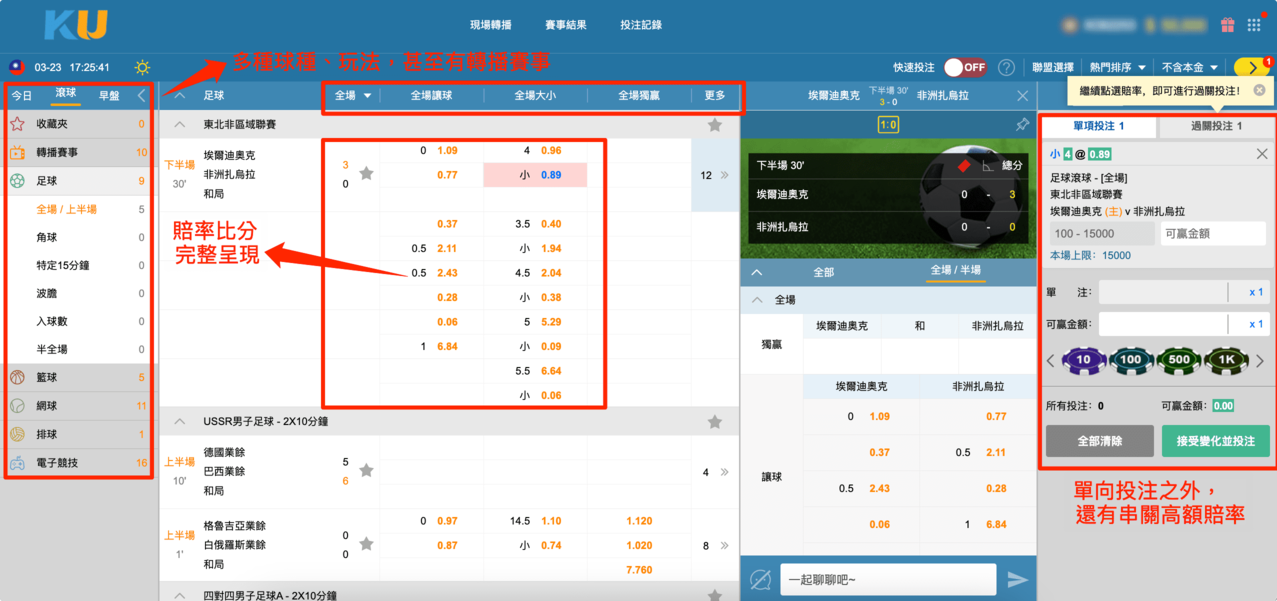 不少玩家接觸線上娛樂城的起因是看準了高賠率的體育博彩,財神娛樂 LEO娛樂城身為遊戲最多的在地資深品牌,當然也要提供會員們好的投注環境囉!在線上娛樂城投注運動彩卷除了方便之外,也有更多場中投注的場次和玩法可以玩,不過和所有要花錢的事物一樣,玩運動彩券一定要事先規劃好預算並加以控制!不過場中投注不完全和賽前投注一樣,要下注就得知道自己到底買了什麼,如果不想花太多錢在「繳學費」,一定要把這篇文章看完喔~
